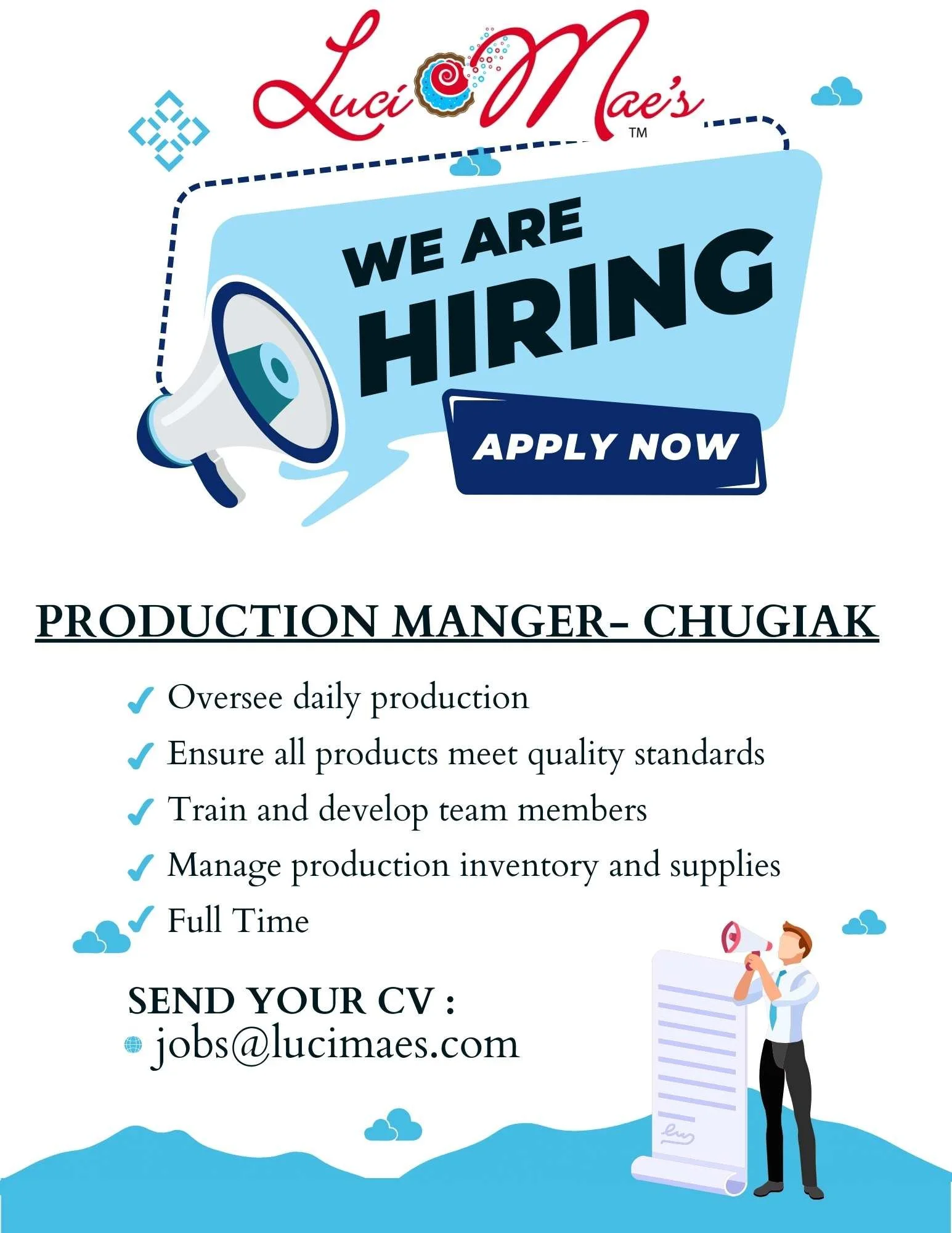 We are looking for a dedicated and experienced Production Bakery Manager. The ideal candidate will have a passion for quality and consistency. Leading a team in a fast-paced environment. As a Production Bakery Manager, you will be responsible for overseeing the daily operations of the production facility, ensuring that all products are made and presented to the highest standards, and that the team is working efficiently and effectively. You will be responsible for training and developing team members, managing inventory, and ensuring that all health and safety regulations are followed. The Production Bakery Manager will also be responsible for maintaining a positive and productive work environment, and for ensuring that all products meet Luci Mae’s stringent consistent quality. This role requires excellent communication and leadership skills, as well as a strong attention to detail and the ability to multitask.